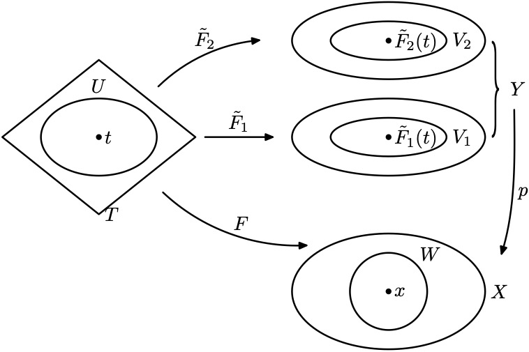 考察$t\in T$, 令$x=F(t)$. 由于$p:Y\to X$是一个复叠空间, 因此存在基础邻域$x\in W\subset X$以及基础切片$V_1,V_2$, 使得$p(V_1)=W=p(V_2)$, 而且$\tilde{F}_1(t)\in V_1$, $\tilde{F}_2(t)\in V_2$.